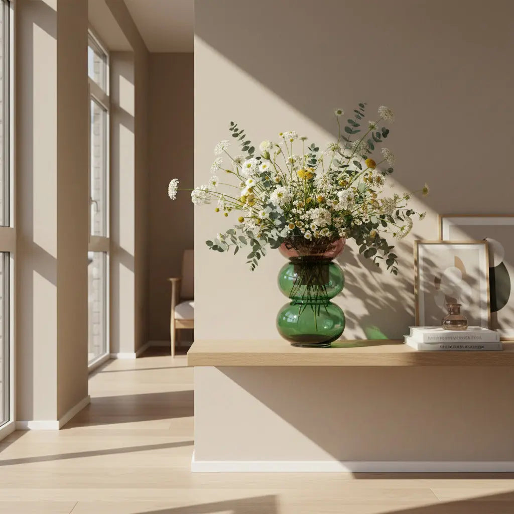 This green glass vase is ideal for making a statement in larger spaces, whether it’s a living room, entryway, or dining room.