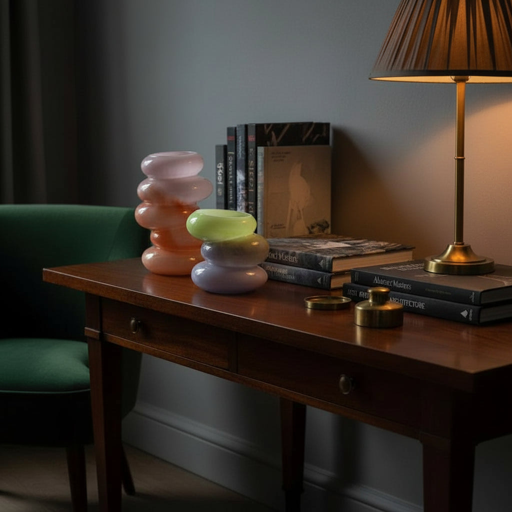 The Swirl Vase Lime is a lime green vase with a sculptural twist. Its compact medium size and distinctive curved form give it visual weight while maintaining a soft, understated presence. Handcrafted from mouth-blown glass, the vase features three rounded layers that tilt gently in motion, forming a swirl silhouette. The surface blends tones of pale green, olive, and soft lilac, giving it a layered look that feels fresh without being loud.
